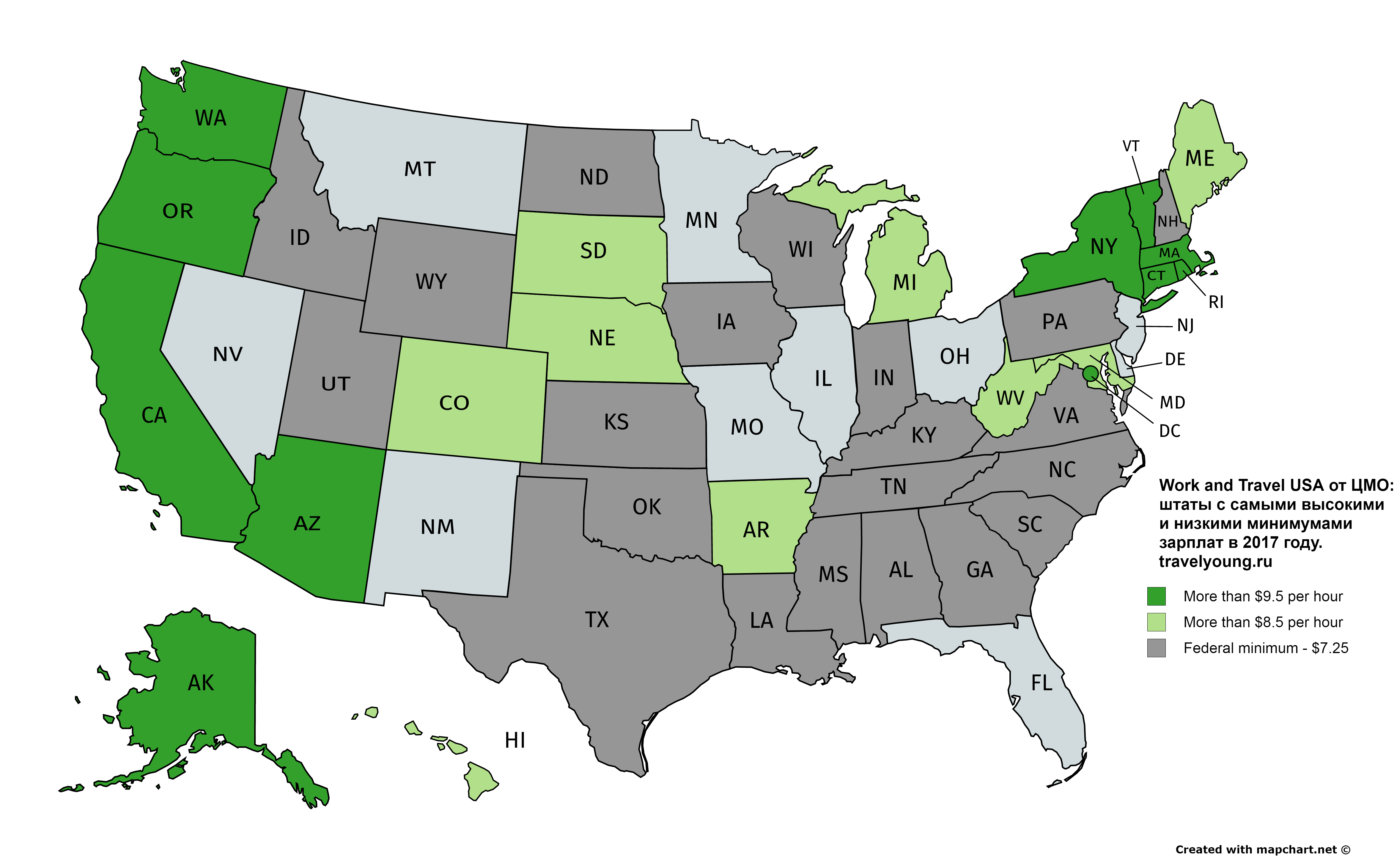 Из других, интересных для участников Work and Travel, штатов можно отметить Connecticut ($10.10), Maryland ($10.10, но скорее всего будет выше) и Alaska ($9.89). В остальных же штатах, открытых для W&T, минимальная зарплата не превышает $9.5 в час, в том числе около 20 штатов имеют минимум, равный федеральному - $7.25 в час.